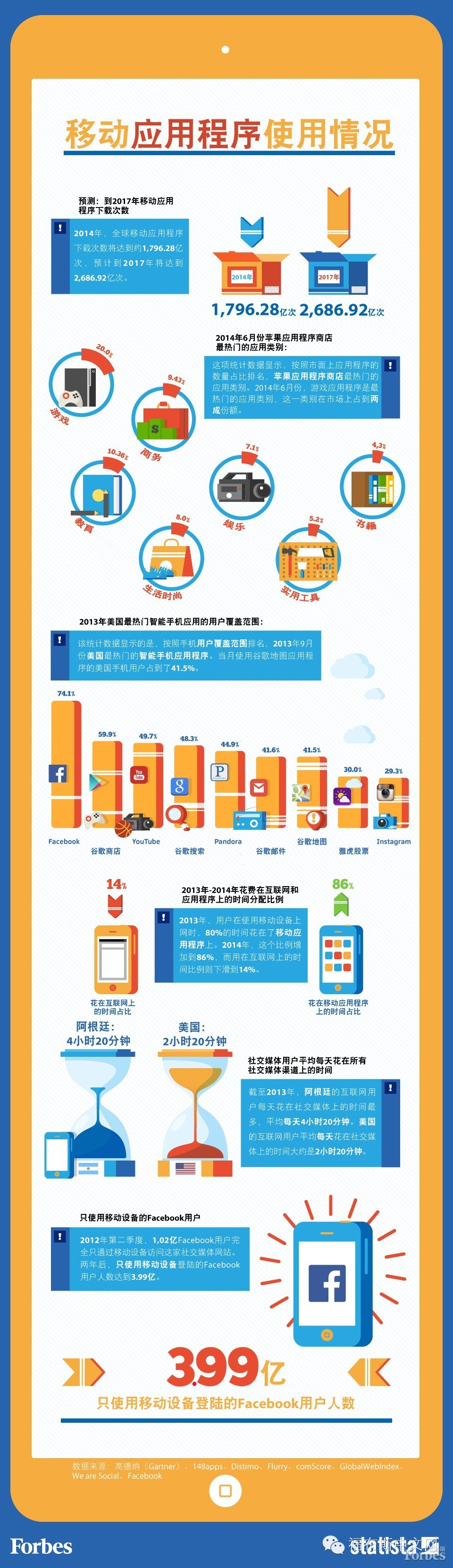 游戏在苹果应用程序商店的应用程序下载总次数当中占到两成,但就用户覆盖范围而言,Facebook遥遥领先。2013年9月份,美国74.1%的手机用户访问了Facebook。早在2012年第二季度,1,02亿用户完全通过移动设备访问Facebook。两年后,这个数字已经增长到高达3.99亿。
