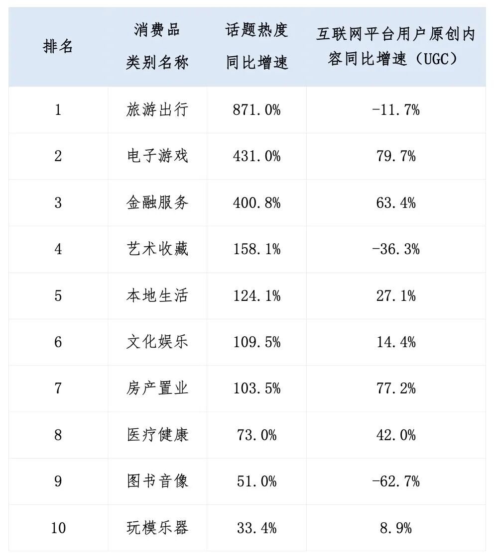 在话题热度方面,第二季度话题热度增速前十的消费品类依次为旅游出行、电子游戏、金融服务、艺术收藏、本地生活、文化娱乐、房产置业、医疗健康、图书音像、玩模乐器。