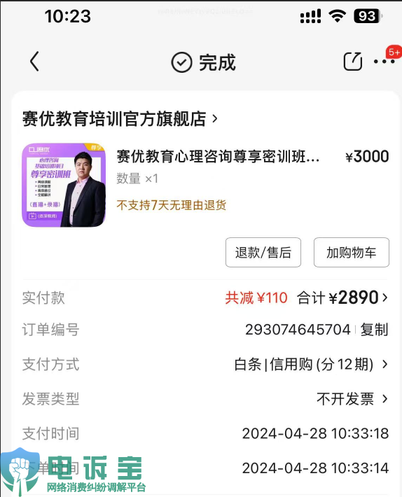 4月28日,陕西省的邸女士向“电诉宝”投诉称,其于2020年10月10日在赛优教育机构购买了价值5880元、有效期八年的自考专升本网课。