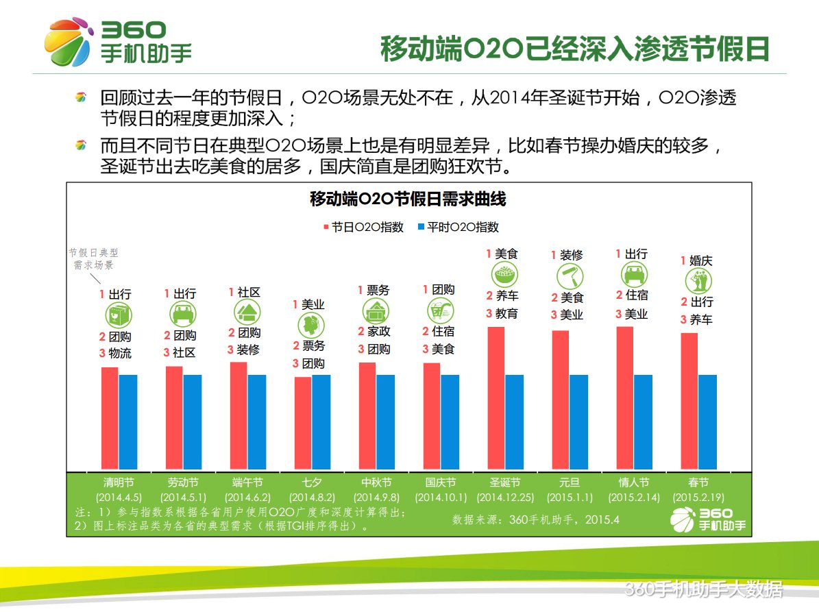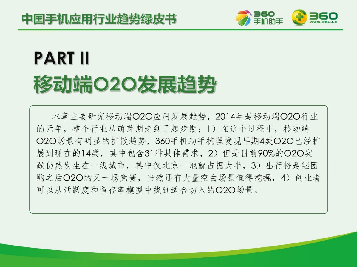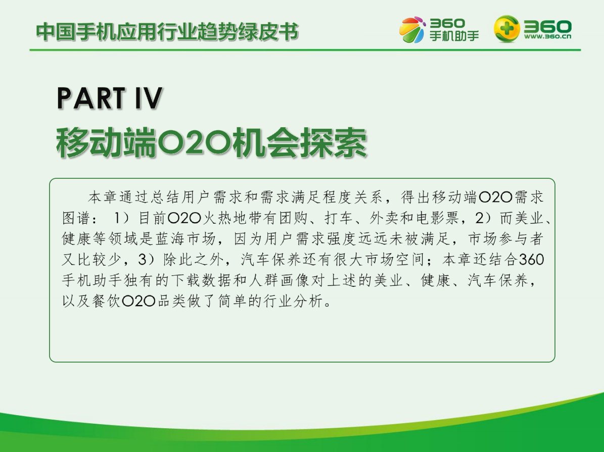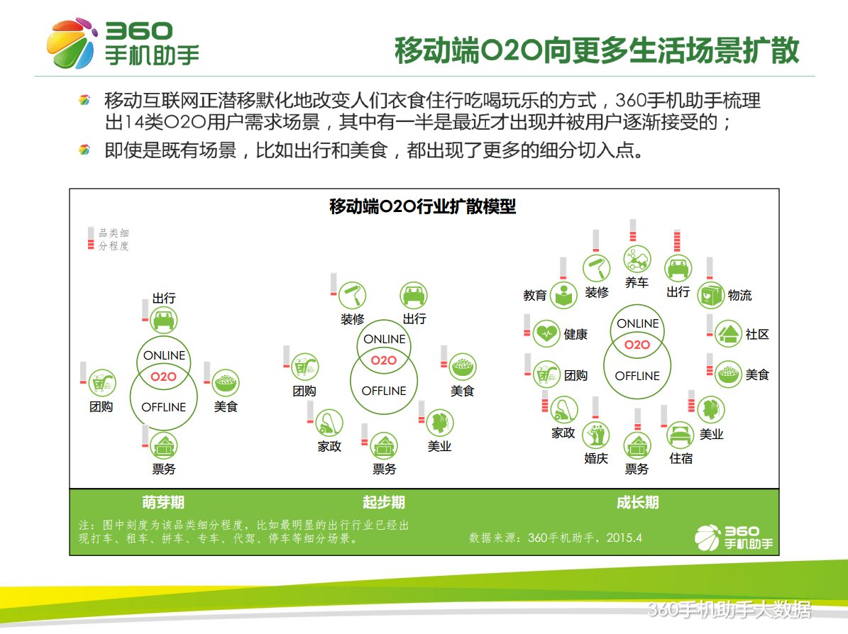 移动端O2O向更多生活场景扩散,360手机助手梳理出14类O2O用户需求场景,其中有一半是最近才出现并被用户逐渐接受的。
