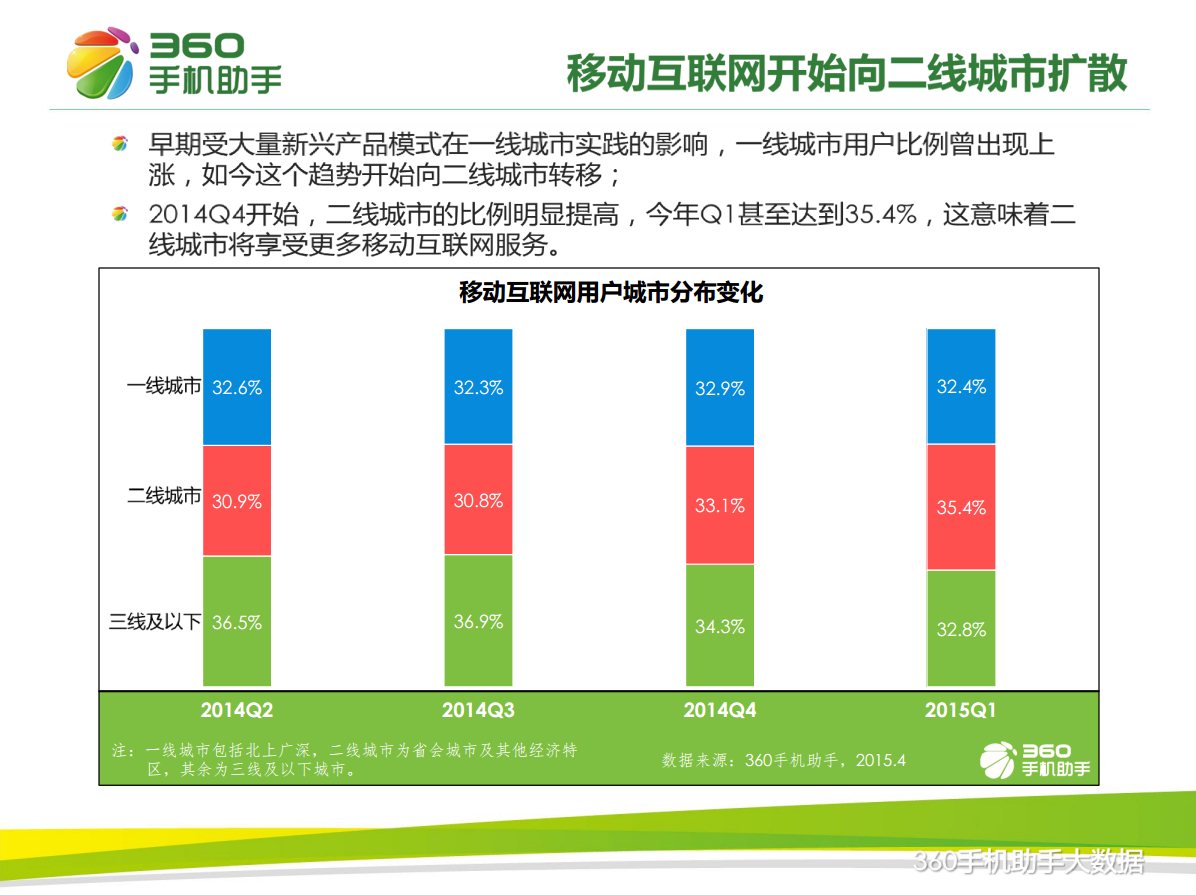 用户的地域结构发生了较大的变化,移动互联网在一线城市的影响开始往二线城市扩散,未来一年二线城市网民将享受到移动互联网带来的“新生活”。