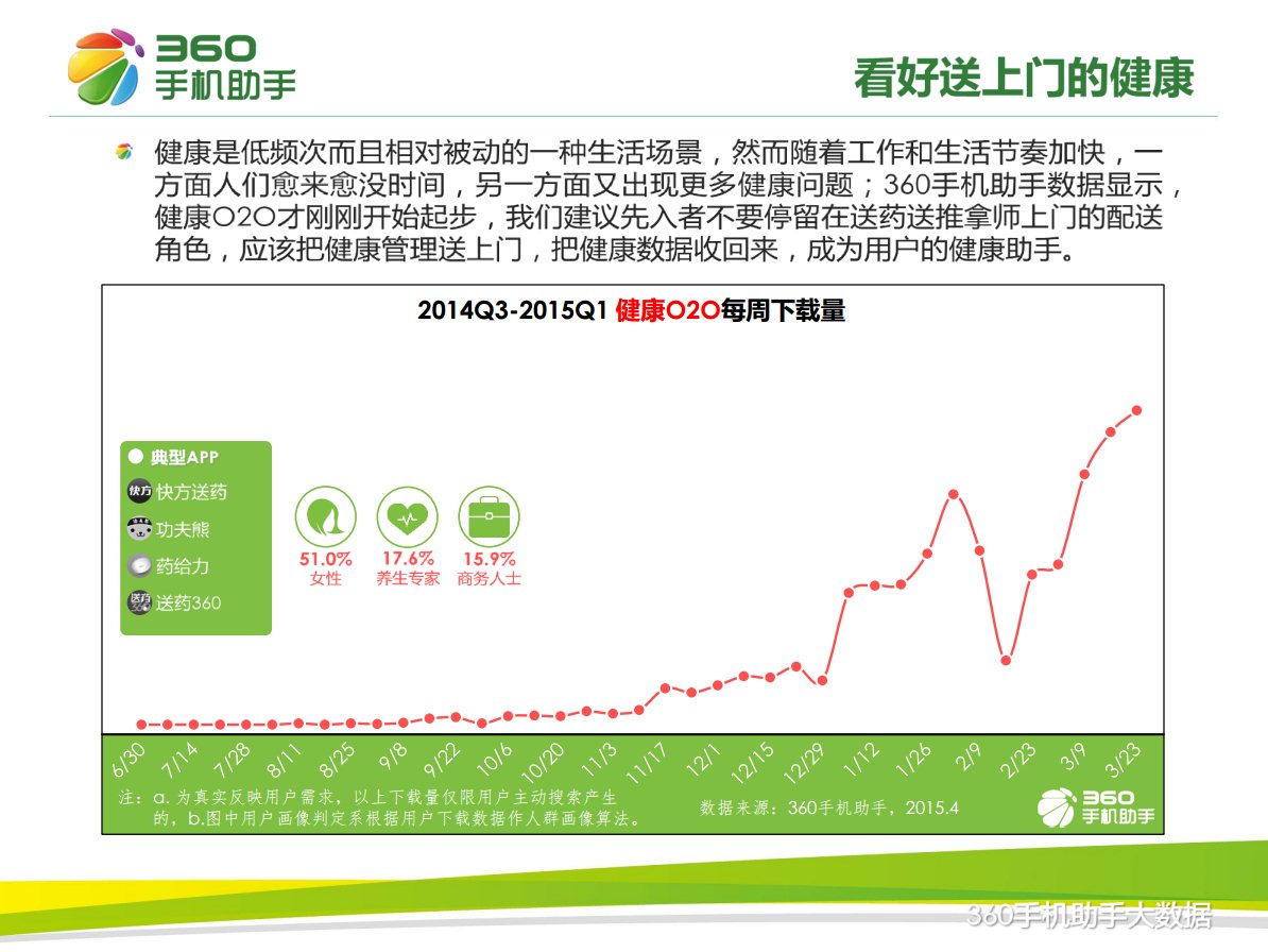 健康是低频次而且相对被动的一种生活场景,刚刚起步的健康O2O领域存在着无限可能。360手机助手建议:先入者不要停留在送药送推拿师上门的配送角色,应该把健康管理送上门,把健康数据收回来,成为用户的健康助手。