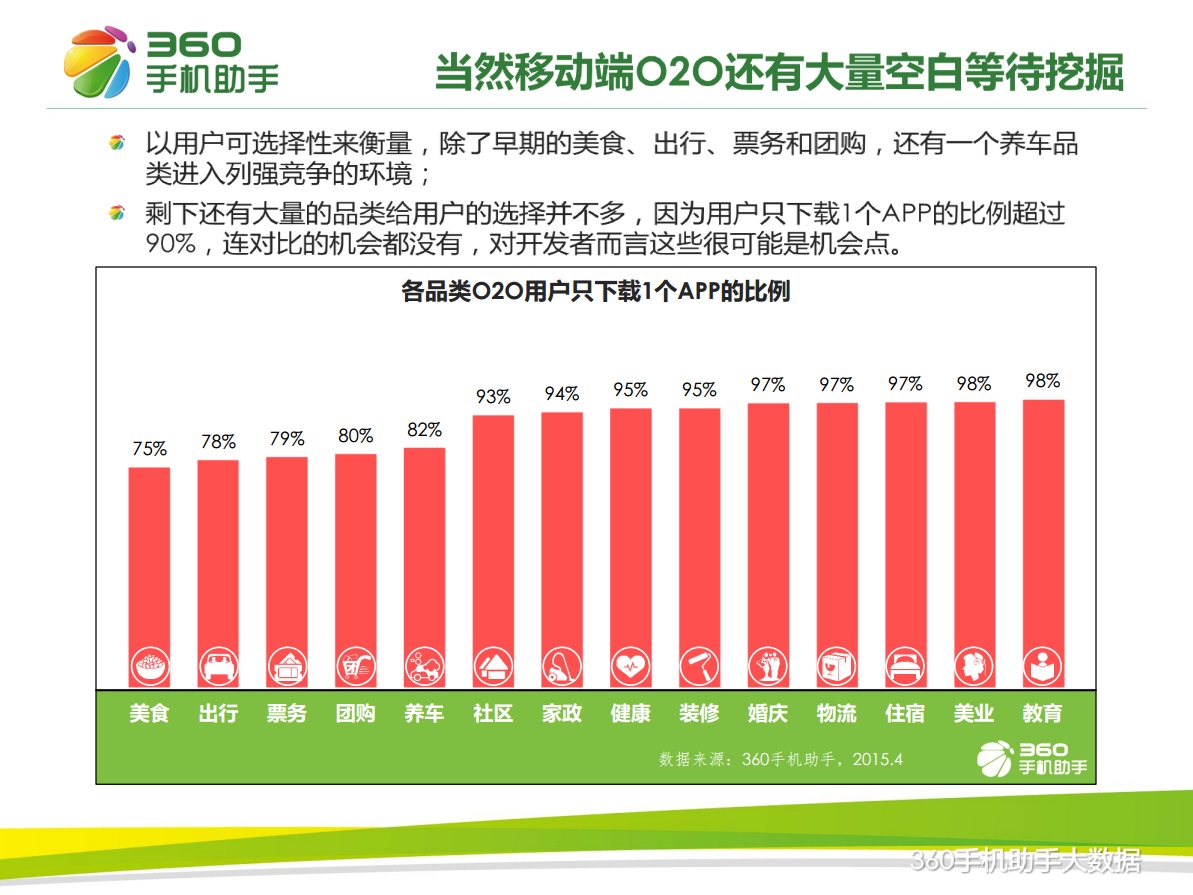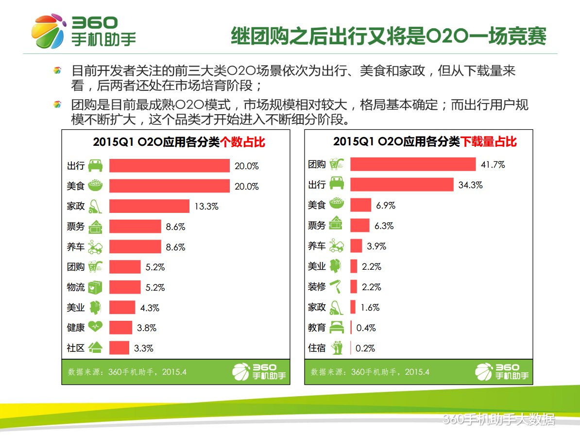 此次360手机助手发布的《2015年第一季度移动应用发展趋势报告》,全面客观地描绘了当前中国移动互联网市场的全新格局,特别是在O2O行业呈现全新爆发式增长的前景下,开发者和移动互联厂商能否对当前APP未来发展方向和运营能力提出了更高的需求,报告提供的一系列数据无论对移动互联开发运营人员和手机终端厂商都提供了极具参考价值的结论。