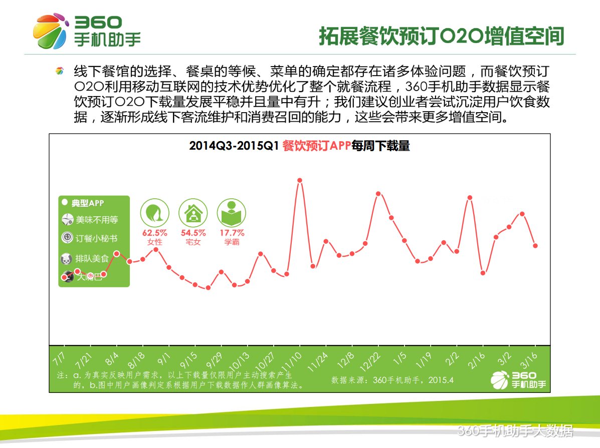 餐饮预订O2O的增值空间仍然不可小觑。360手机助手数据显示餐饮预订O2O下载量稳中有升;建议创业者尝试沉淀用户饮食数据,逐渐形成线下客流维护和消费召回的能力。