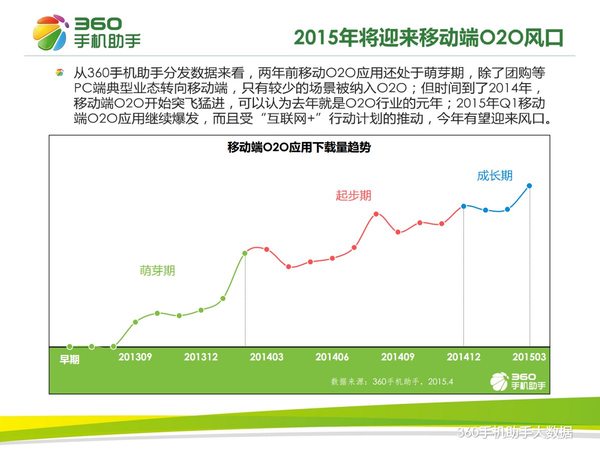 从360手机助手分发数据来看,两年前移动O2O应用还处于萌芽期;2014年堪称O2O行业的元年;2015年Q1移动端O2O应用继续爆发,受“互联网+”行动计划的推动,今年有望迎来风口。