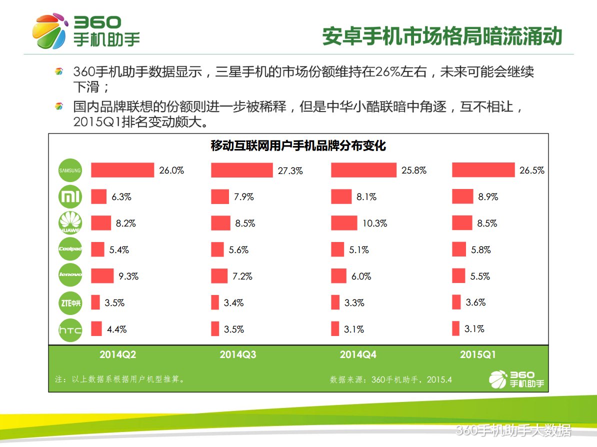 今年安卓手机市场的竞争更加惨烈,“中华小酷联”互不相让,2015Q1市场排名变动颇大。