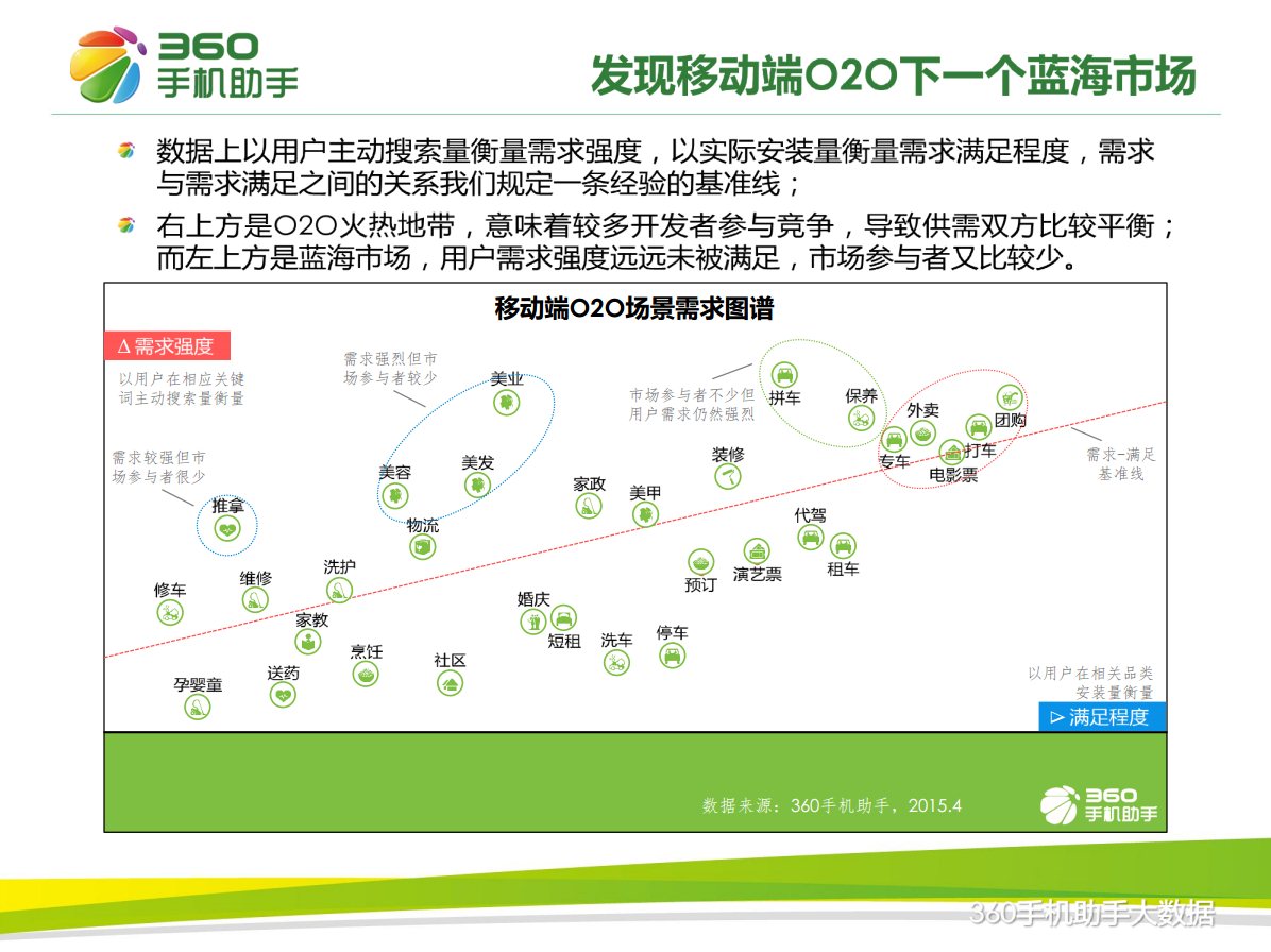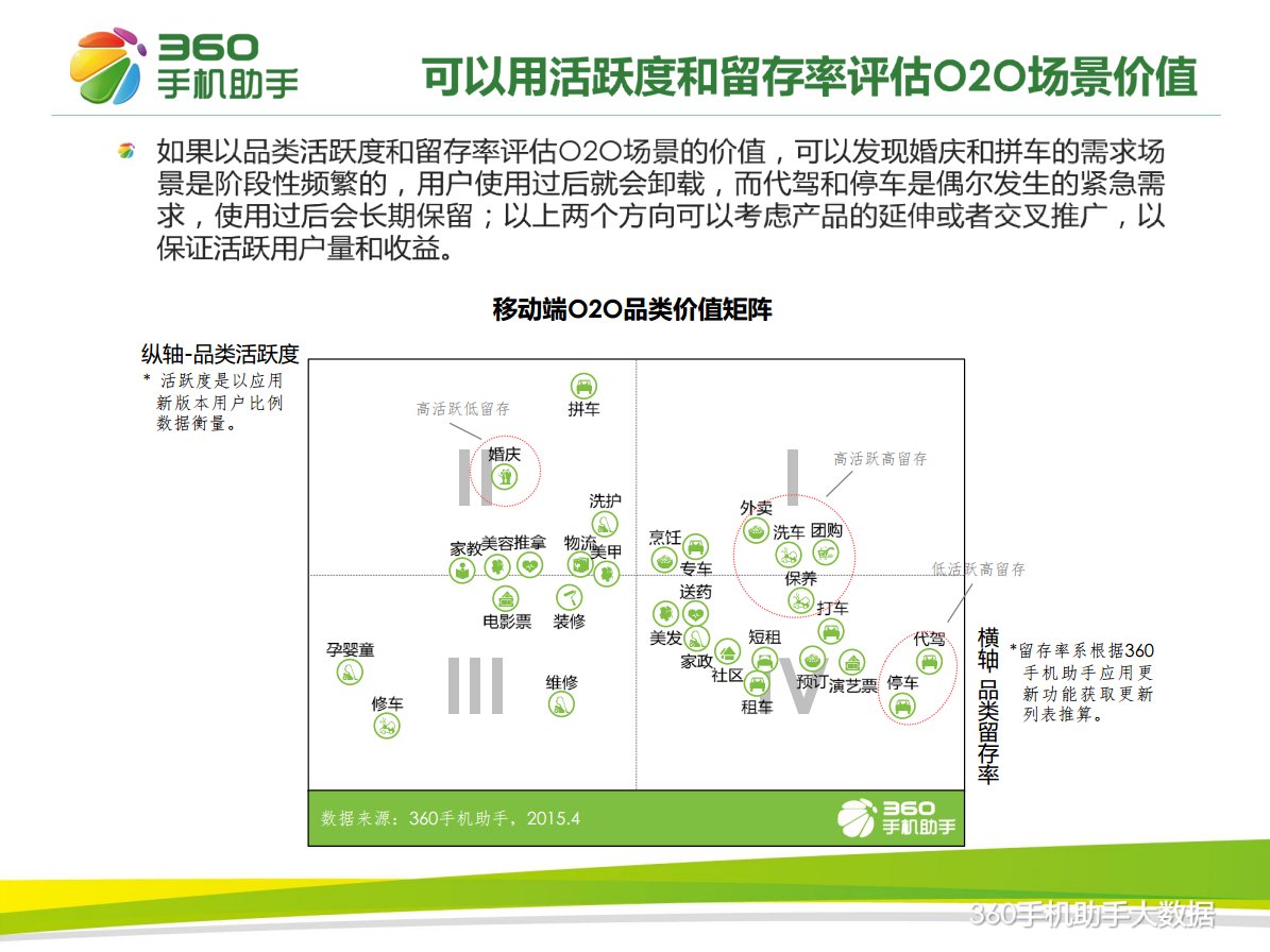 而O2O场景价值可以用活跃度和留存率评估。360手机助手大数据研究表明:婚庆和拼车的需求场景是阶段性频繁的,用户使用过后就会卸载,而代驾和停车是偶尔发生的紧急需求,使用过后会长期保留;以上两个方向可以考虑产品的延伸或者交叉推广,以保证活跃用户量和收益。