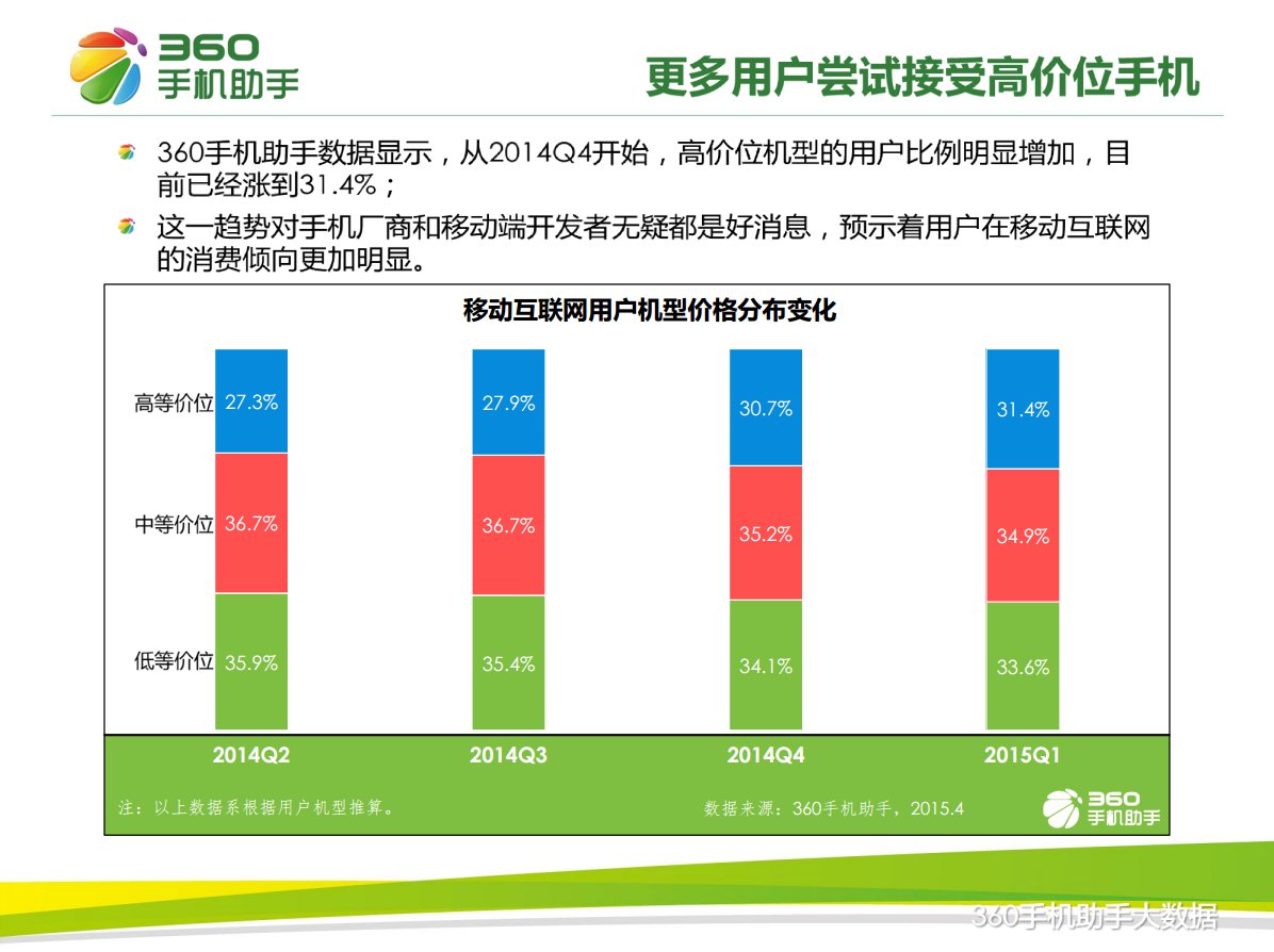 另一方面,从2014Q4开始,高价位机型的用户比例明显增加,目前已经涨到31.4%。这一趋势对手机厂商和移动端开发者无疑都是好消息,预示着用户在移动互联网的消费倾向更加明显。