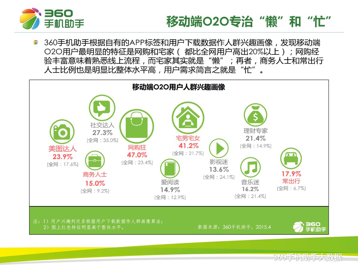 360手机助手根据对APP标签和用户下载数据作为人群兴趣画像,可以发现移动端O2O用户下载比例最高的分部为网购狂、宅男宅女、美图达人、常出行人士、商务人士。