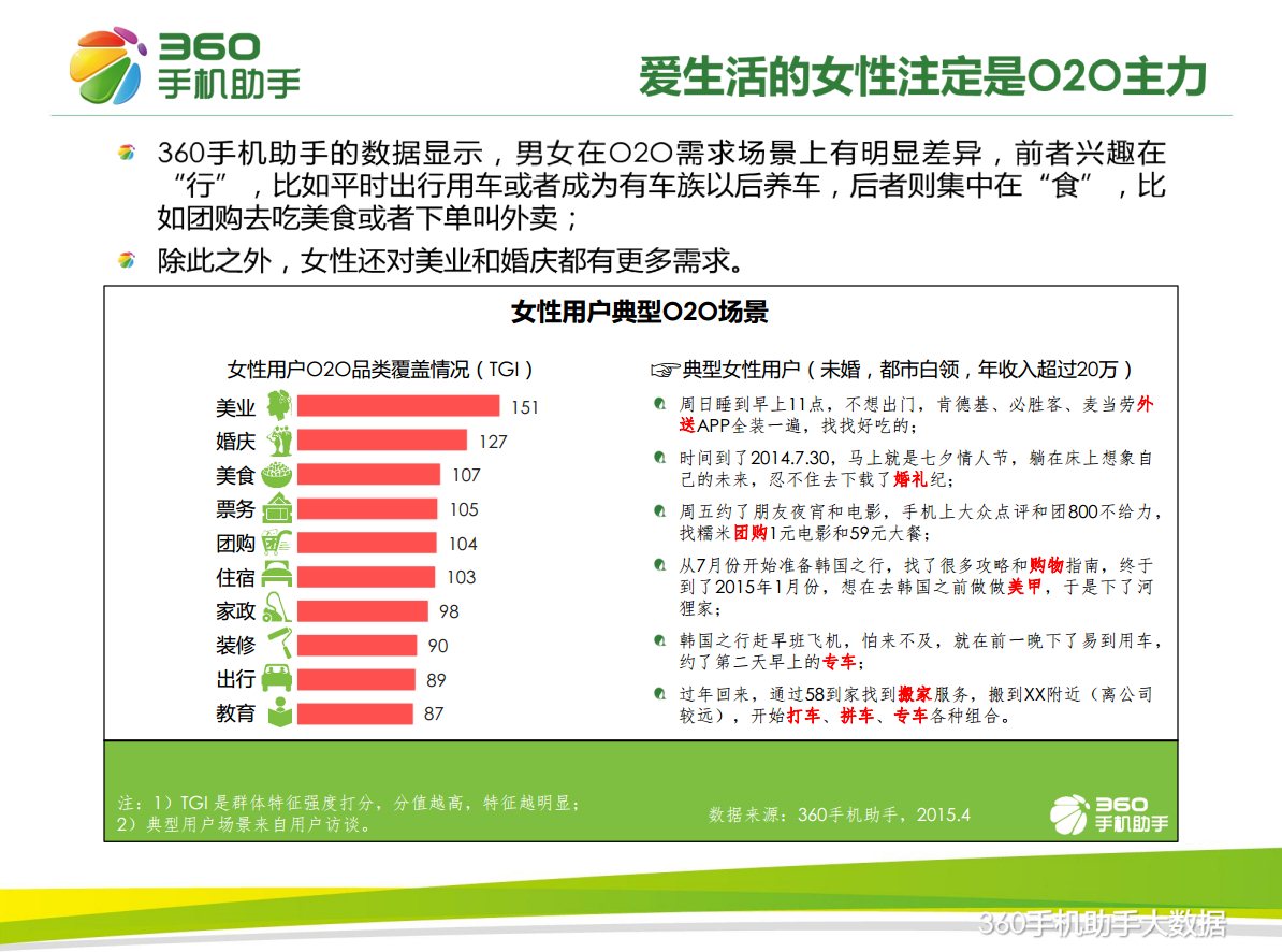 通过对数据分析发现,男性用户与女性用户在O2O需求场景上也有着明显差异,男性用户主要集中在“行”,如出行用车或者养车服务;而女性用户则集中在“食”,比如团购和外卖,同时女性用户也对美容、婚庆、票务等O2O场景应用需求旺盛。