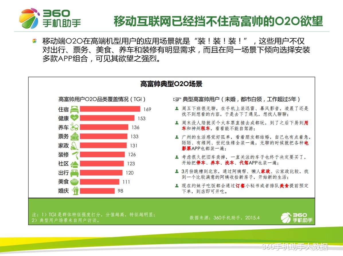 移动端O2O在高端机型用户的应用场景就是“装!装!装!”,这些用户在同一场景下倾向选择安装多款APP组合,O2O欲望十分强烈。