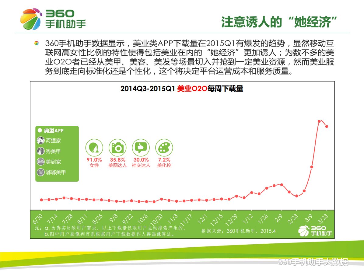 360手机助手的监测数据显示,美业类、健康类、养车O2O类APP下载量在2015年第一季度有爆发的趋势,同时包括美业类在内的诸多O2O类App受“她经济”的影响,需求将不断上升。