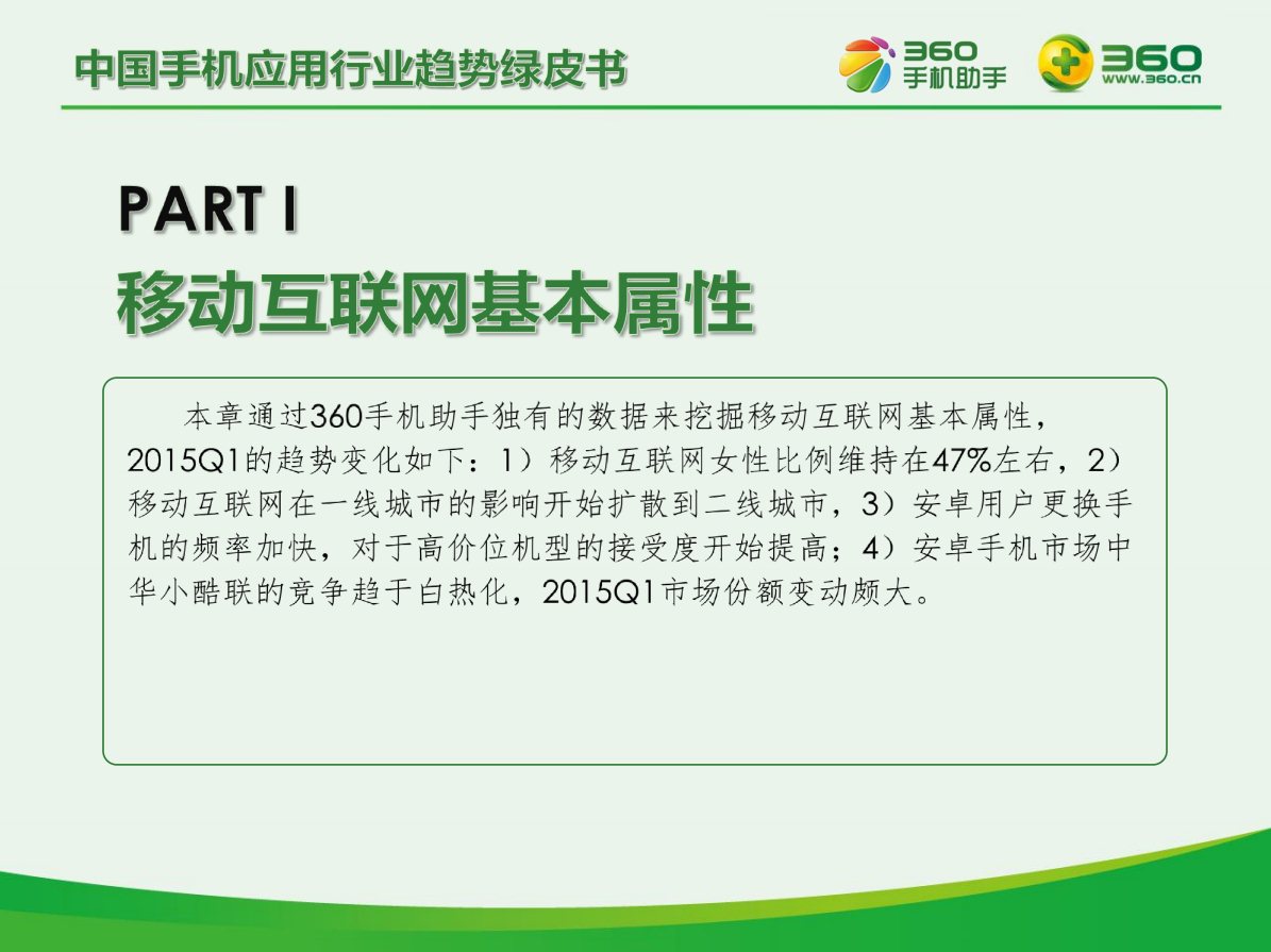 4月22日,360手机助手与360手机游戏共同发布了《2015年Q1中国手机应用行业趋势绿皮书》和《2015年Q1手机游戏行业趋势绿皮书》两份行业深度报告。报告直观、权威地反映了当前国内国内智能手机用户、手机游戏玩家、手机硬件厂商及手机APP特别是O2O领域的行业现状,并对整个移动互联网生态进行了详尽分析。