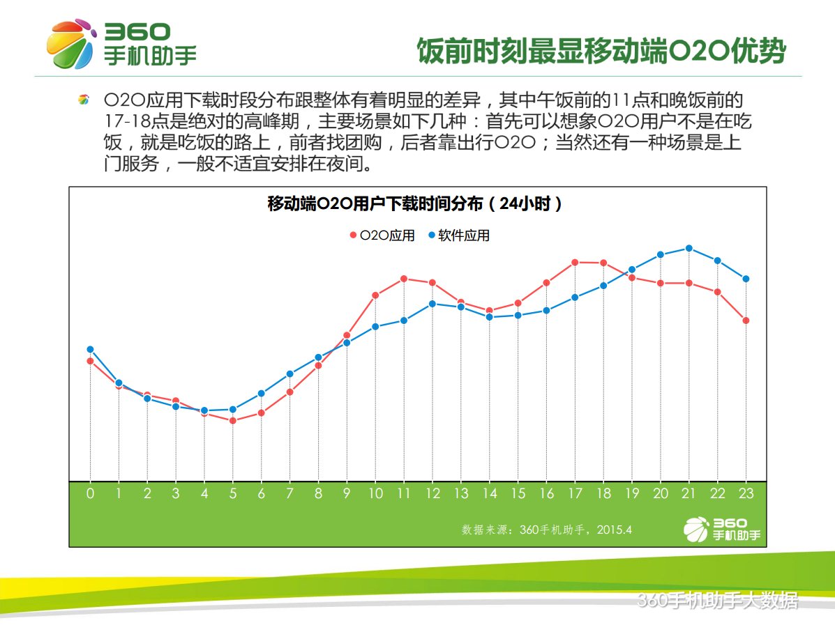 360手机助手同时对O2O应用的下载时段进行了统计分析,数据显示午饭前的11点和晚饭前的17~18点是下载O2O应用的高峰期,而凌晨4~6点则是O2O应用下载的全天最低峰。